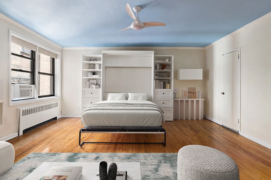 Welcome to apartment 3E at 82 Irving Place, a beautifully renovated studio nestled on one of Manhattan’s most picturesque, tree-lined streets. This spacious, open-concept layout easily accommodates a queen-sized bed, sofa, and dining area, while maintaining clear separation between living, dining, and sleeping spaces. A built-in Murphy bed with drawers and shelving enhances functionality and storage.